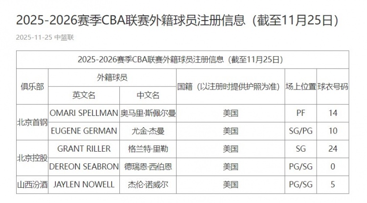 11月25日訊 今天,CBA官網(wǎng)更新了新賽季外援注冊信息,其中北京男籃新增注冊斯佩爾曼,山西男籃注冊了杰倫·諾威爾。