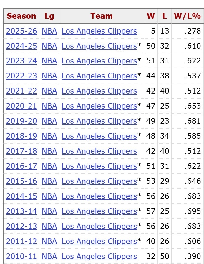 據(jù)統(tǒng)計,這是隊史自2010-11賽季以來(勝率39%),快船近15年勝率最低的戰(zhàn)績。