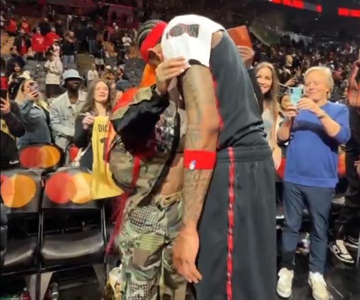 11月27日訊 NBA杯東部A組,猛龍97-95險(xiǎn)勝步行者。此役,英格拉姆出場38分12秒,23投11中(三分4中1),罰球5中3,拿到26分8籃板2搶斷1蓋帽,還命中準(zhǔn)絕殺。賽后,英格拉姆和女友在場邊秀恩愛。GIF-英格拉姆格女友擁抱接吻