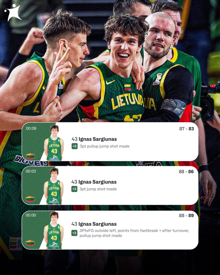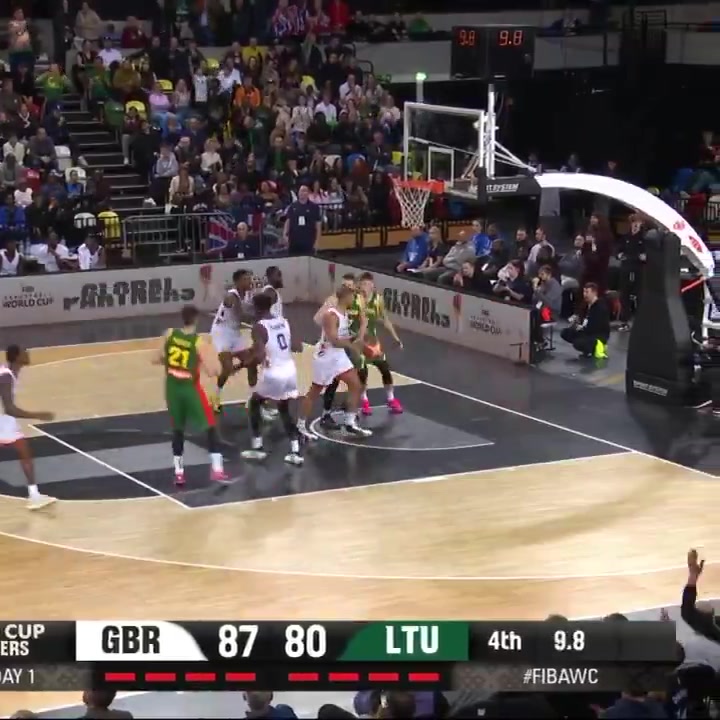 當(dāng)時(shí)時(shí)間還剩12.9秒,立陶宛80-87落后英國(guó),Sargiuna轟進(jìn)三分球時(shí)間定格9.8秒,隨后的時(shí)間他又轟進(jìn)了兩顆三分球,最后英國(guó)遭遇世界難題,Sargiuna以一記超遠(yuǎn)三分完成壓哨絕殺。