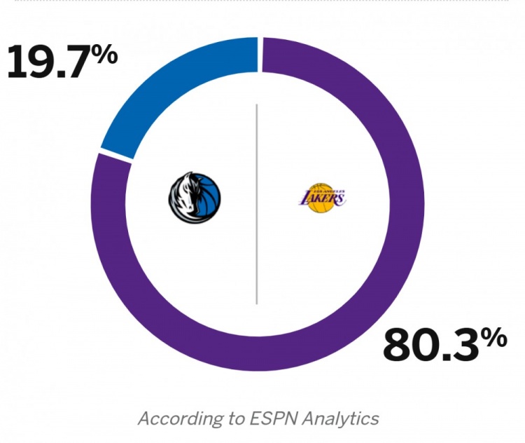 ESPN對(duì)這場(chǎng)比賽勝率進(jìn)行了預(yù)測(cè),湖人勝率80.3%,獨(dú)行俠僅為19.7%。