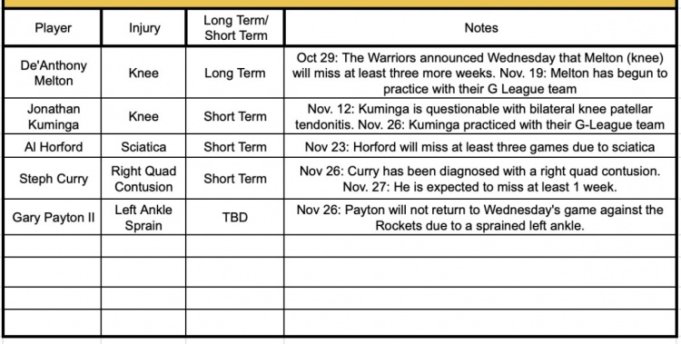 11月28日訊 今日,ESPN記者Bobby Marks曬出一組勇士的陣容統(tǒng)計數據。“傷病嚴重影響了勇士本賽季的表現。在前20場比賽中,他們已經使用了8套不同的首發(fā)陣容?!盡arks寫道。目前勇士以10勝10負排在西部第8位。