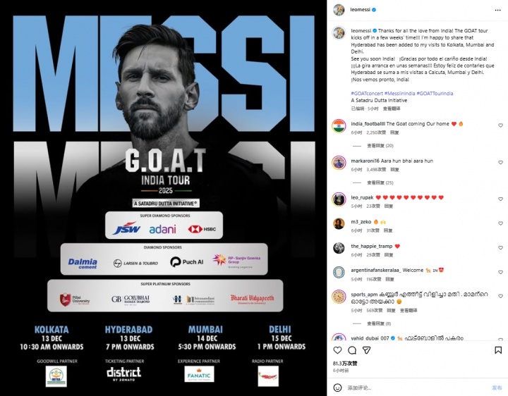 11月28日訊 梅西更新社媒,宣布12月印度行新增一站海得拉巴。